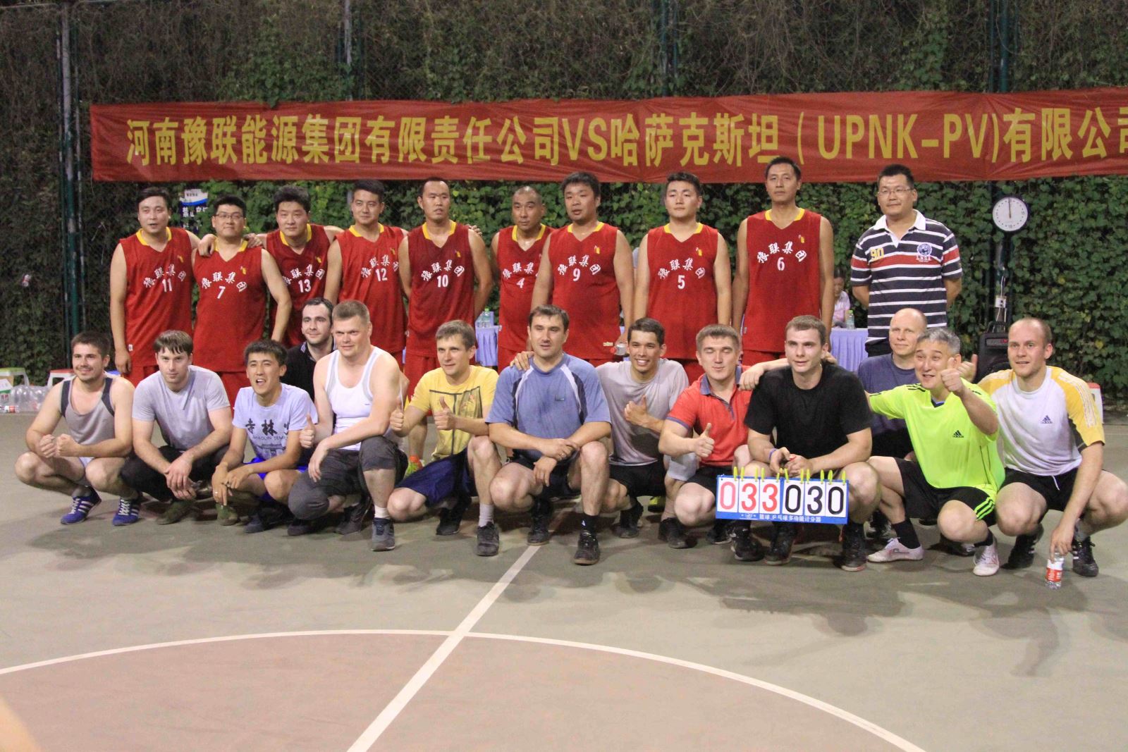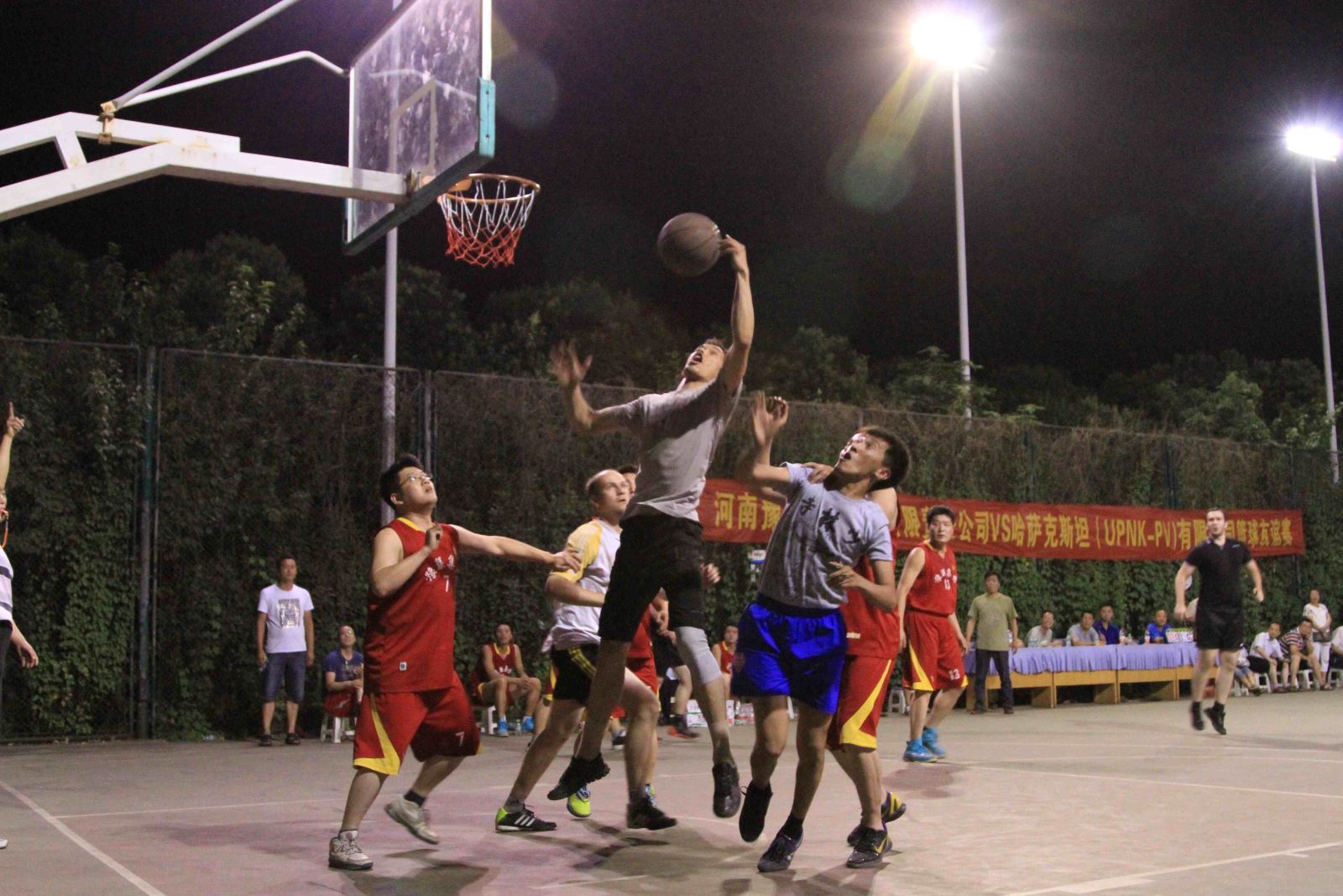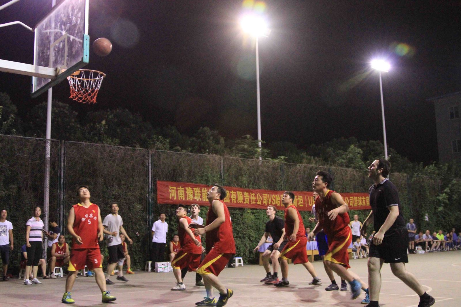 6月12日晚8點,豫聯園區擴建指揮部籃球場內燈火通明,人頭攢動,這里正在舉行一場豫聯集團與哈薩克斯坦UPNK-PV公司籃球友誼賽。