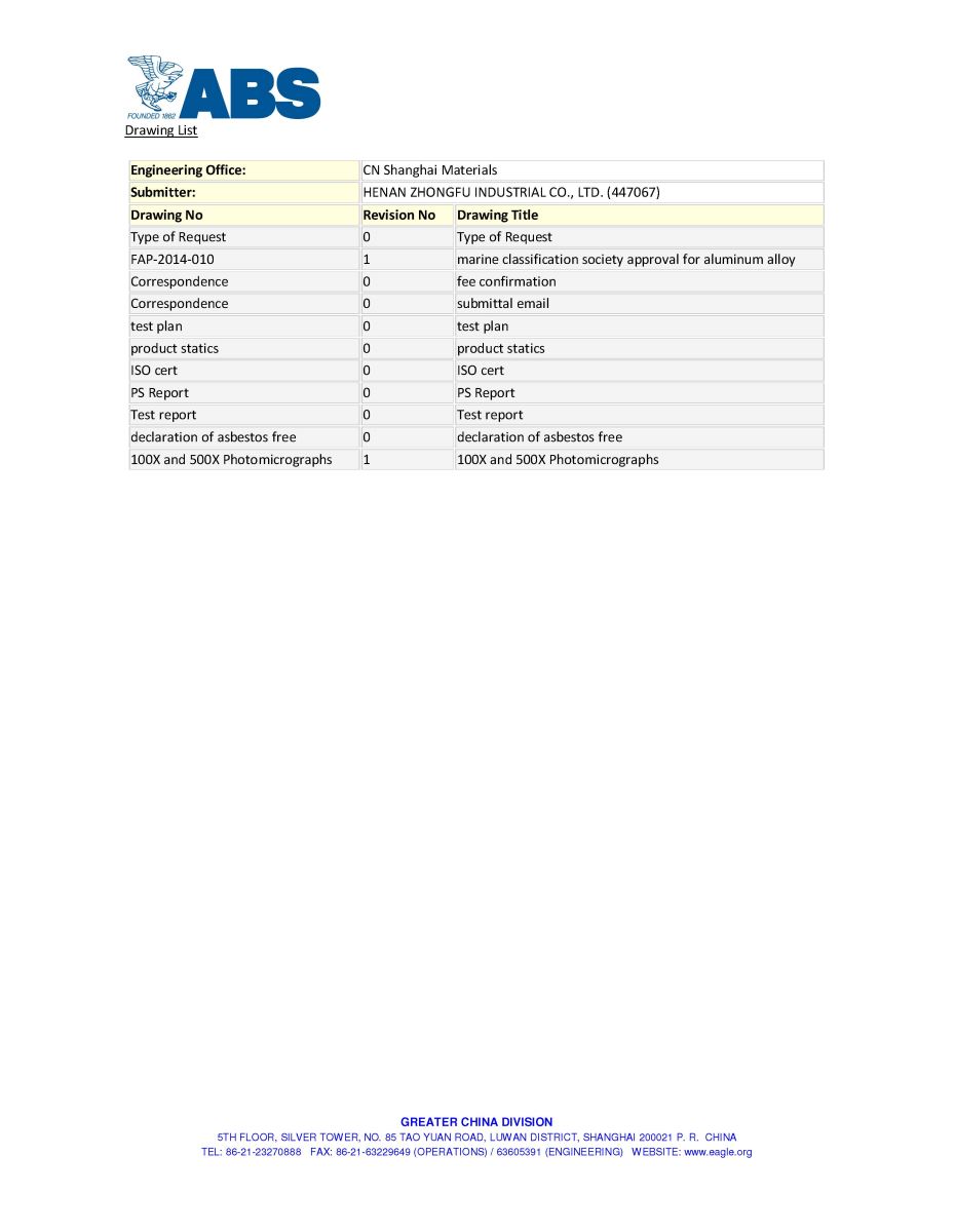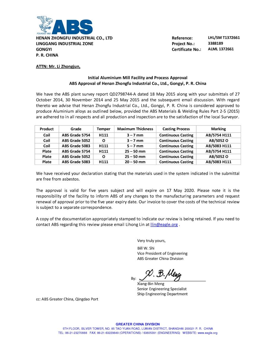 繼之前通過ISO/TS16949汽車板認證和英國船級社(LR)認證之后,近日,中孚高精鋁公司生產的5083、5754、5052合金卷材和板材產品順利通過美國船級社(ABS)認證,相關信息已在美國船級社官網公布。