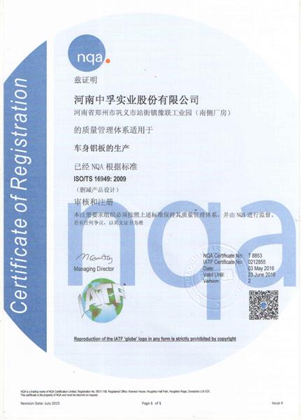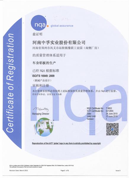 TS16949汽車板認證證書